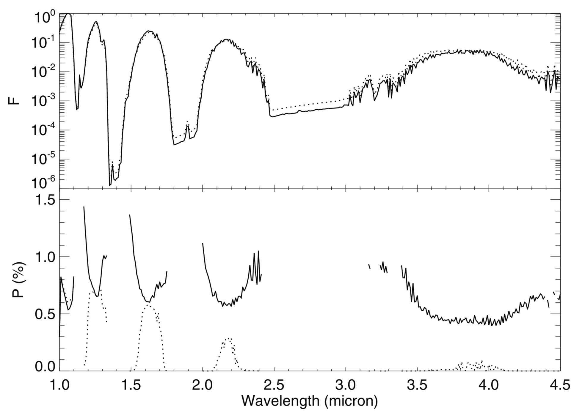 The spectrum (top panel) and polarized spectrum (bottom panel) of a 10 Jupiter-Mass planet, by de Kok et al. 2011. Two models are shown: one with clouds at the top of the atmosphere, and one with clouds at a lower altitude (0.015 bar). While the spectra of the two models are nearly identical, the polarized spectra of the two models are very different. We hope to use WIRC+Pol to carry out studies to measure the polarized spectra of brown dwarfs in order to provide empirical measurements of the cloud heights. Ultimately we want to understand how these cloud heights (and other cloud properties) change as a function of spectral type and temperature.
