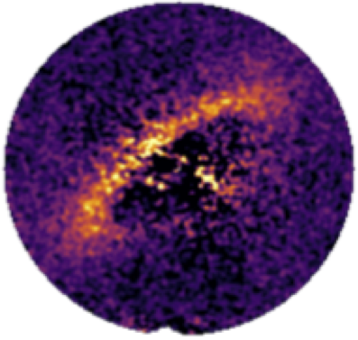 In this GPI image of the disk we see an image of the nearly edge-on disk in polarized intensity, where the dust from the disk is extremely forward-scattering. Also overlaid on top is an image of the directly imaged planet Beta Pictoris b, seen in total intensity in the same dataset. In this study we found that the morphology of the disk could not be completely explained by the known directly imaged planet, suggesting that there could be another unseen planet in the system perturbing the disk. Link: Millar-Blanchaer et al. 2015.